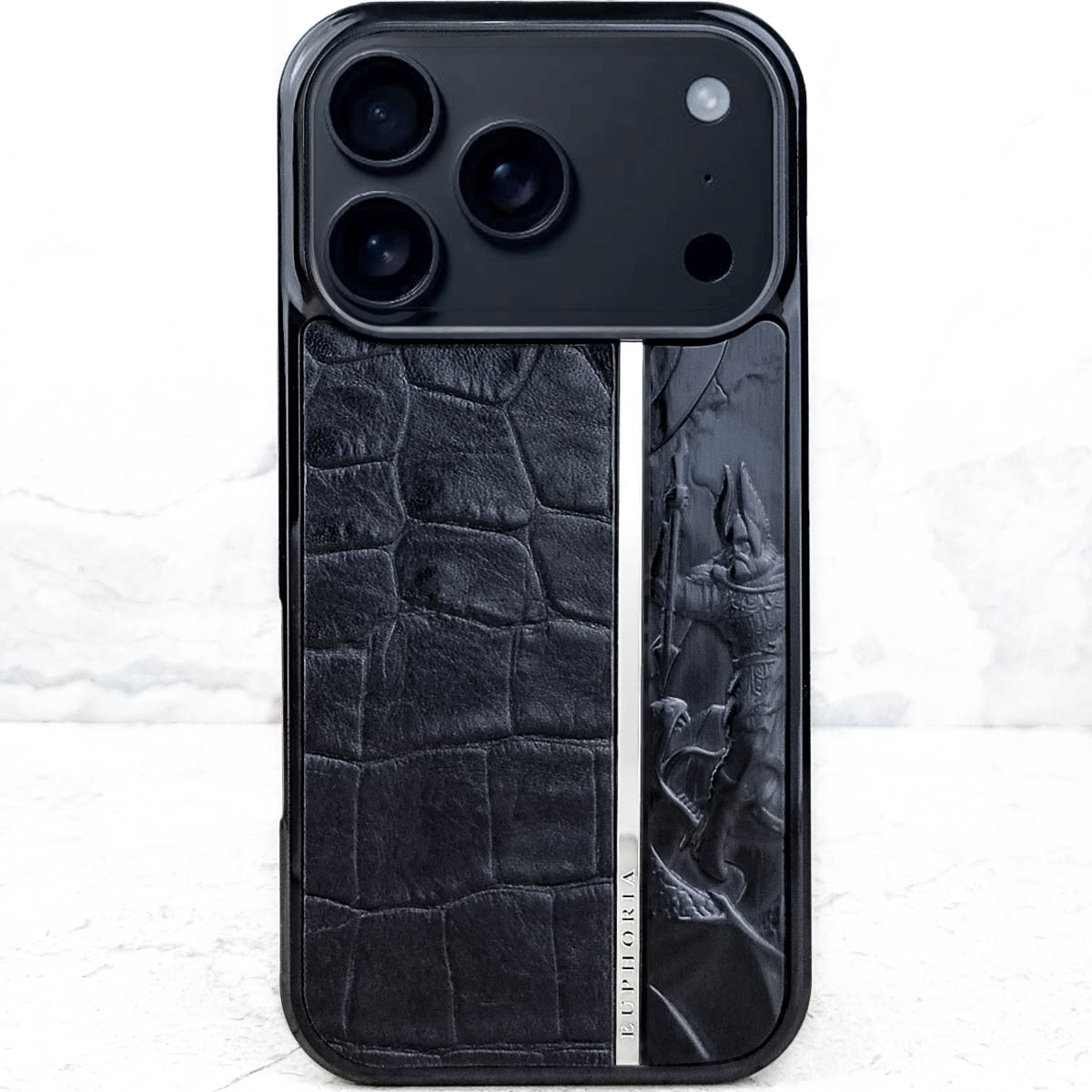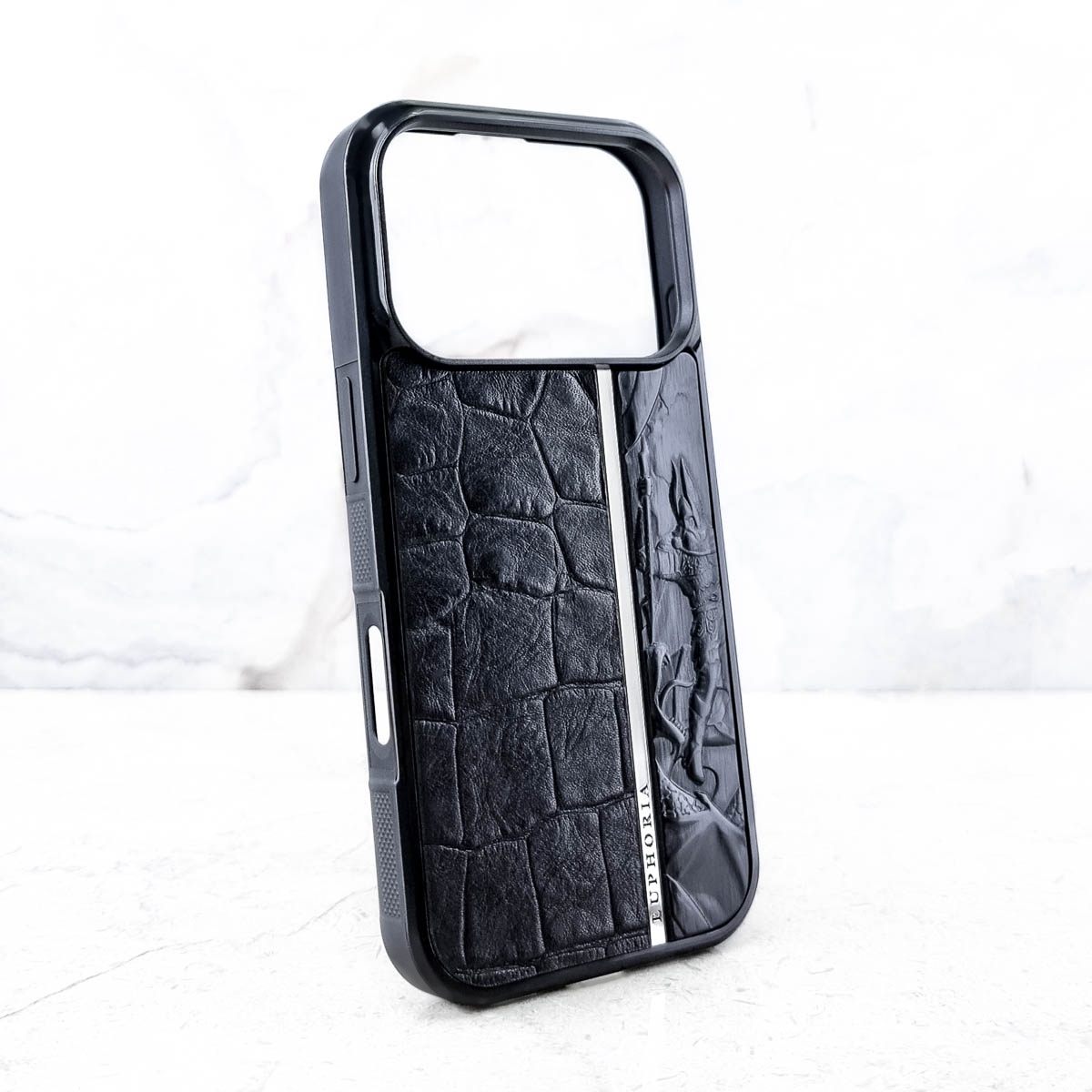 Премиальный чехол iPhone из натуральной кожи с качественным тиснением под крокодила, композитного обсидиана и ювелирным сплавом - это солидный аксессуар для серьезного человека.