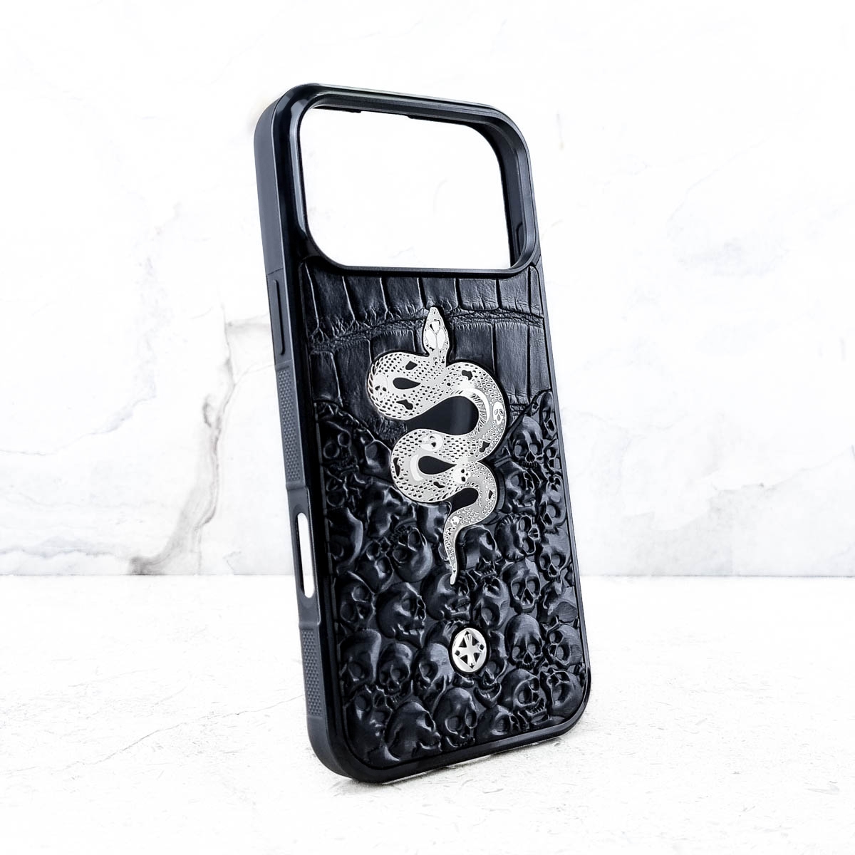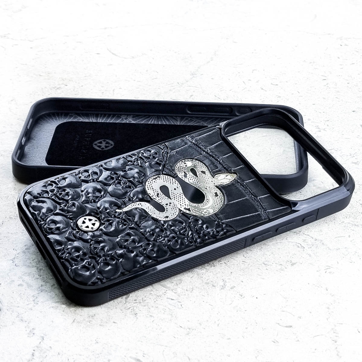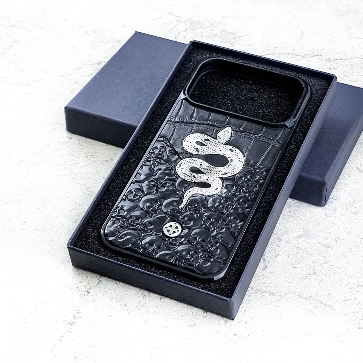 Премиальный чехол для iPhone из натуральной кожи крокодила украшен изящной змеей из ювелирного металлического сплава. Завершают композицию черепа из композитного обсидиана. Этот модный аксессуар символизирует мудрость, спокойствие и силу, воплощенные в образе металлической змеи.