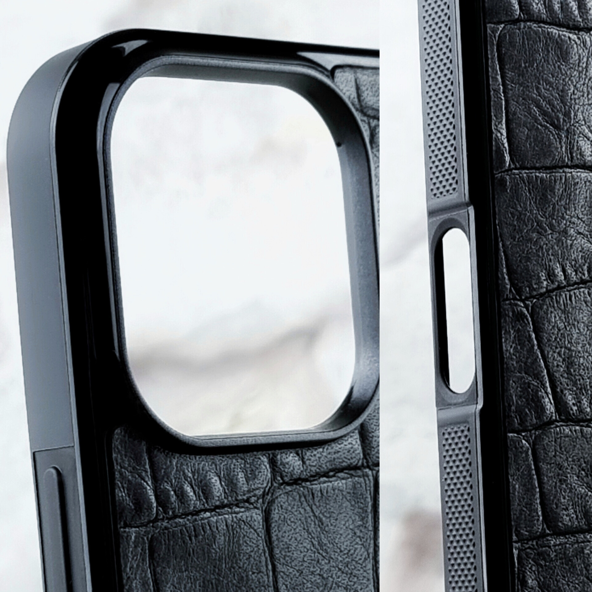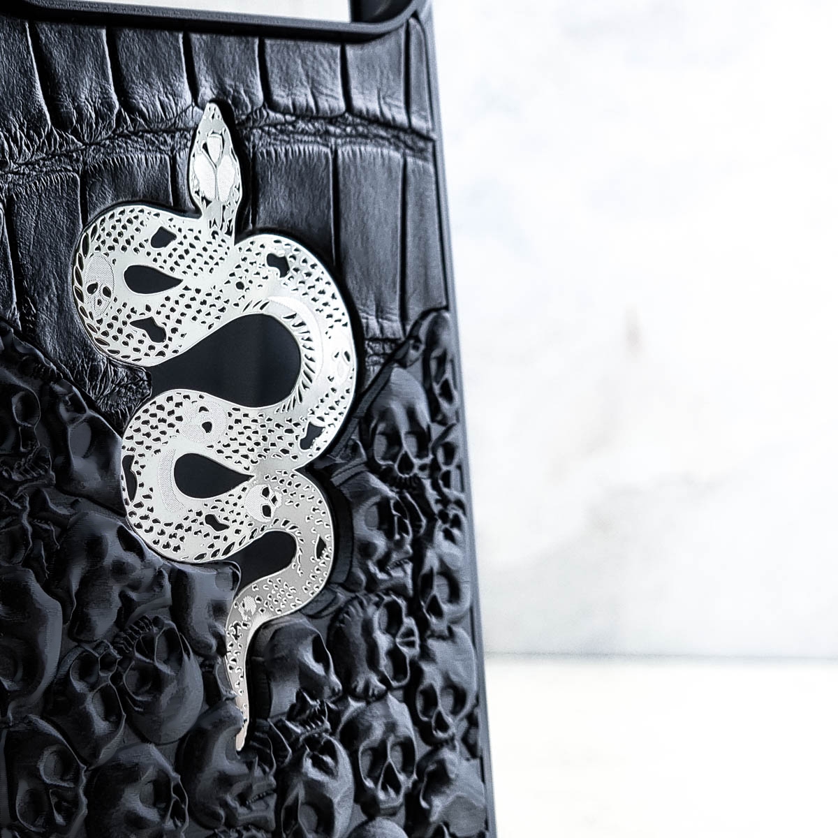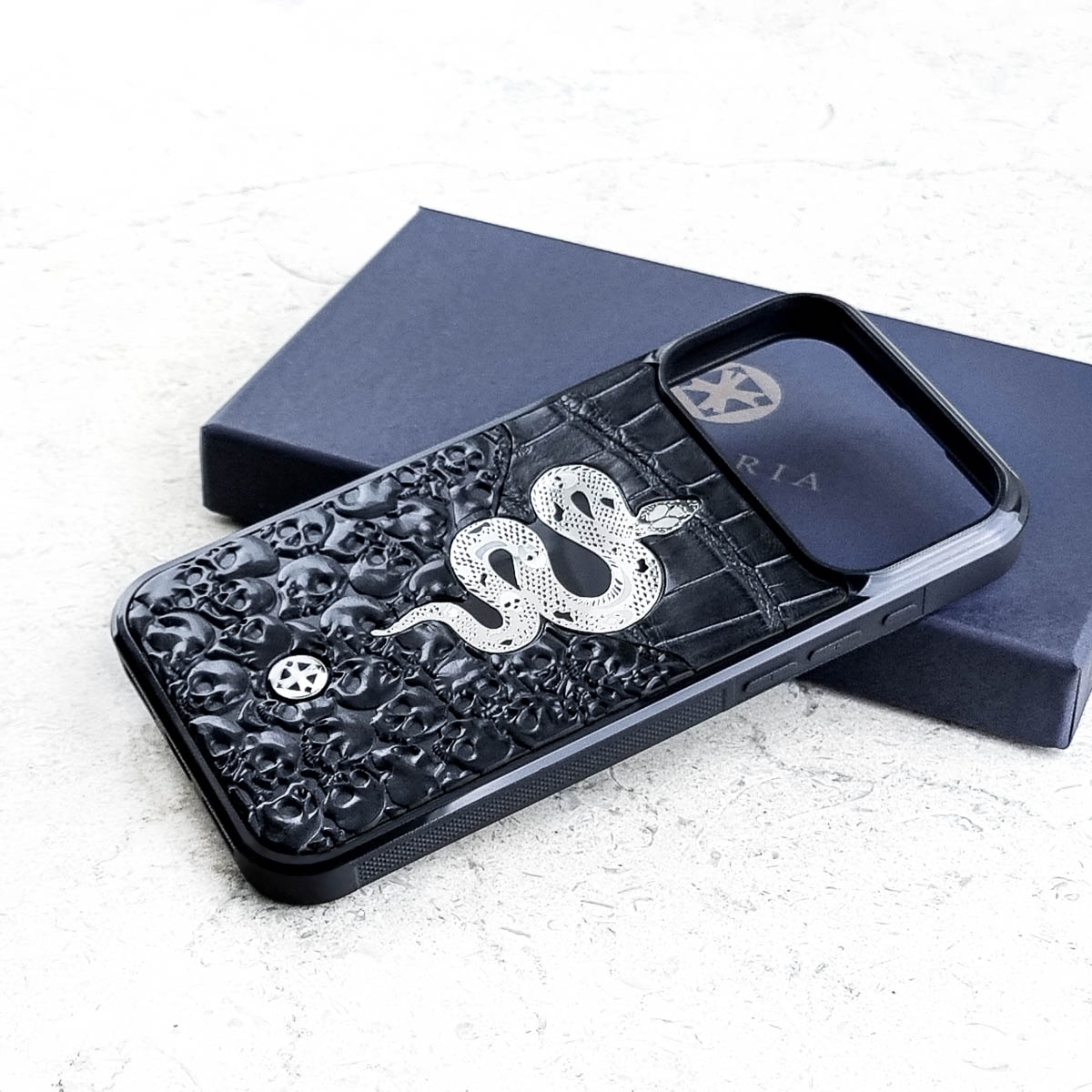 Премиальный чехол для iPhone из натуральной кожи крокодила украшен изящной змеей из ювелирного металлического сплава. Завершают композицию черепа из композитного обсидиана. Этот модный аксессуар символизирует мудрость, спокойствие и силу, воплощенные в образе металлической змеи.