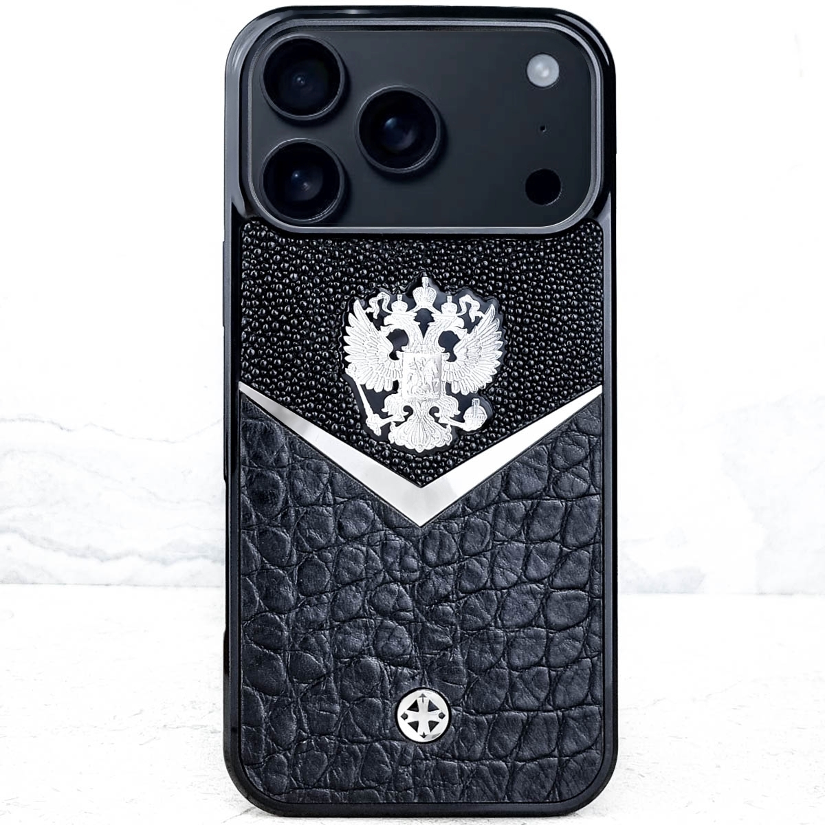 Чехол для iPhone с гербом РФ, выполненным из ювелирного сплава, премиум аксессуар из патриотической коллекции с натуральной кожей морского ската и фирменной галкой Euphoria из металла с кожей теленка итальянской выделки с качественным тиснением под крокодила. Этот роскошный чехол выполненный в лаконичном стиле, с мягкой подложкой с обратной стороны, защитит Ваш телефон.