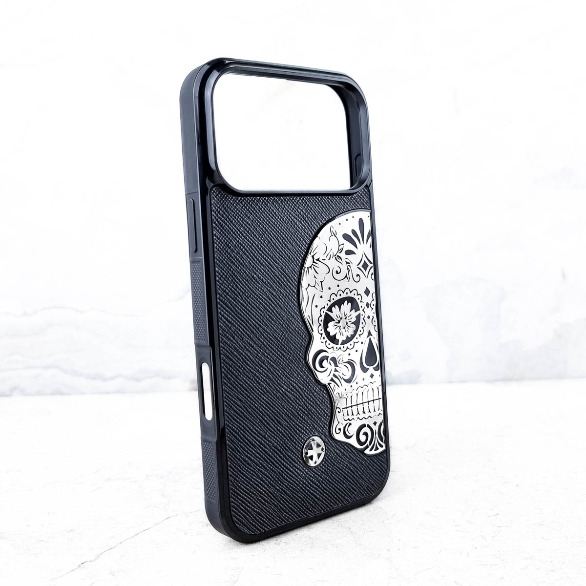 Стильный чехол с натуральной кожей, выделки Saffiano (Италия), для iPhone с качественной высокодетальной мексиканской символикой Sugar Skull, и фирменным логотипом Euphoria выполненными из металла, покрытым защитным слоем ювелирного композита. Этот премиальный аксессуар с мягкой подложкой с обратной стороны станет надежной защитой для вашего смартфона.
